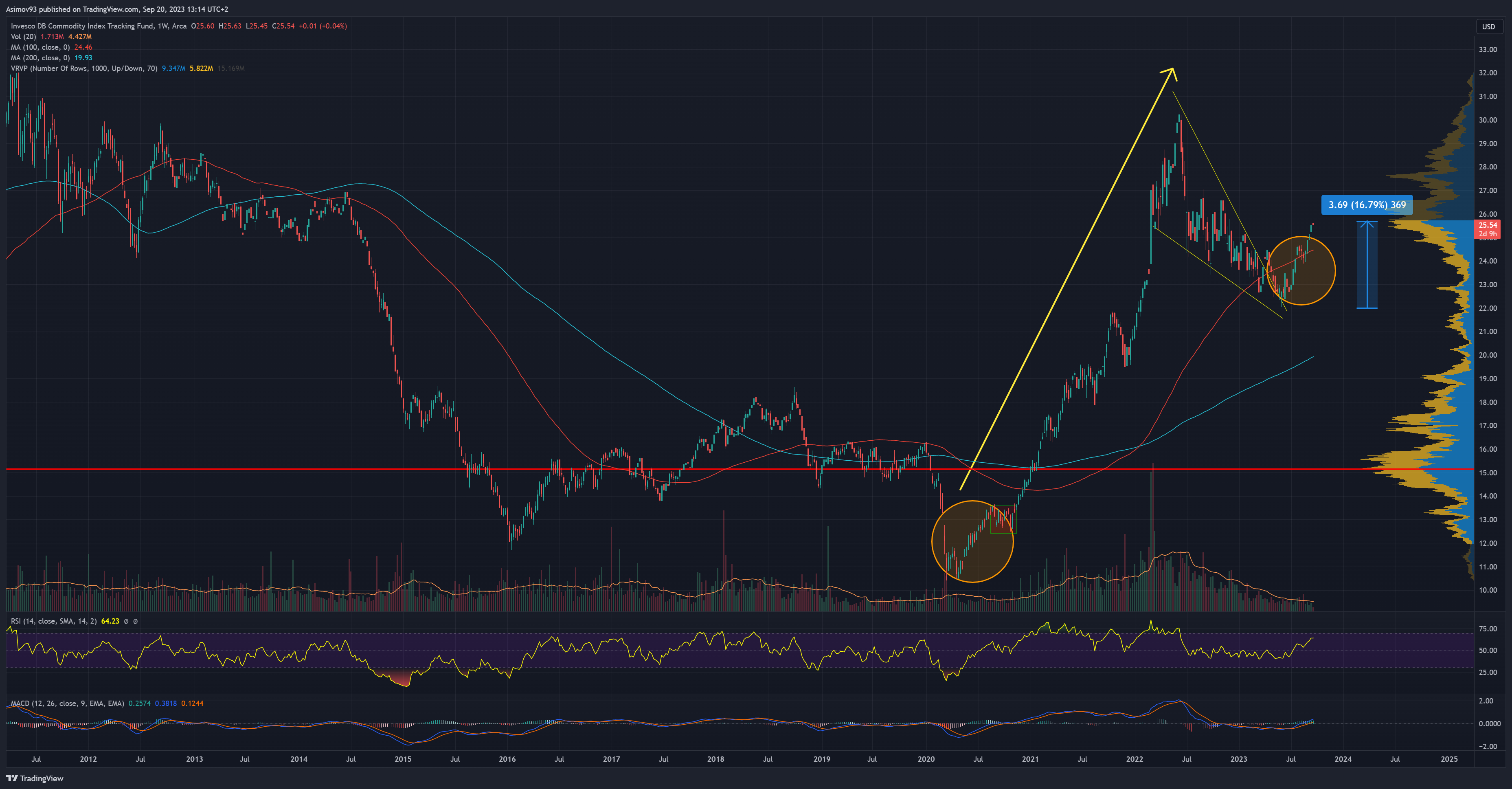 Co se týká aktuální situace, komoditní index jen za předešlých pár měsíců posílil o téměř 17 %. Na tak velký trh jde o obrovský posun vpřed. Lokální minimum se datuje do konce května. Růst má pouze jednu vadu na kráse, chybí mu objemy. Všimněte si ovšem období kolem léta 2020 (zvýrazněná oblast), kdy objemy též nebyly nic moc. Až po akceleraci růstu začaly postupně stoupat.