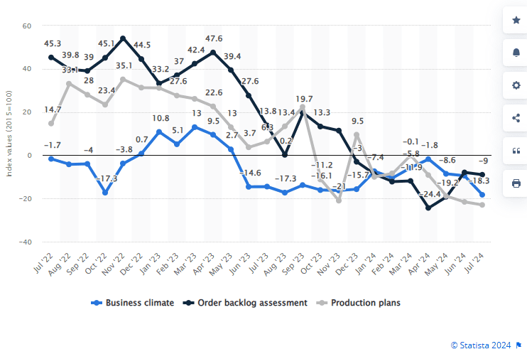 V souvislosti s těmito změnami čelí širší německá ekonomika výzvám, jak nám ukazuje následující obrázek, kde je vidět pokles objednávek, výroby a celkové zhoršení ekonomické nálady.