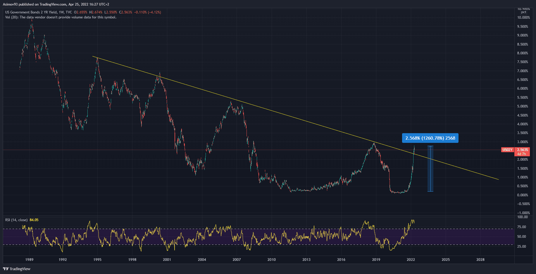 Rostoucí výnosy (úrokové míry) na amerických federálních dluhopisech jsou v současnosti vskutku probíraným tématem – hlavně kvůli částečné inverzi výnosové křivky. I my jsme se souvisejícím tématům v poslední době dost věnovali. Rostoucí tržní úrokové míry jsou logickým důsledkem restriktivní měnové politiky a blížící se recese. Proto se jedná o velkého strašáka, hlavně pro investory a spekulanty na akciovém trhu. Potažmo bitcoinu – pro bitcoin platí v podstatě stejná pravidla jako pro akcie.