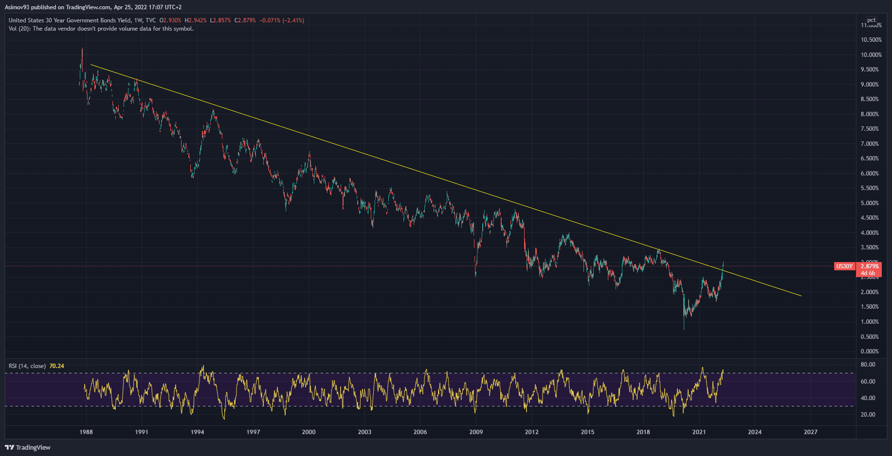 Na výnosech s 30letými federálními dluhopisy je ten samý trend. A i zde došlo k průlomu trendové čáry. Jak ale běžně zmiňuji, trendové čáry jsou spíše takovou jednoduchou a užitečnou pomůckou. Proto bych ten průlom bral s rezervou.