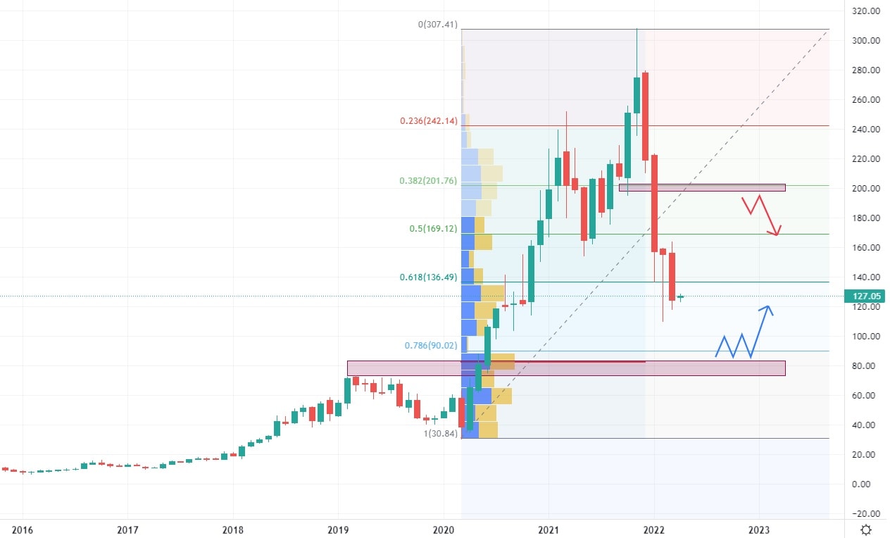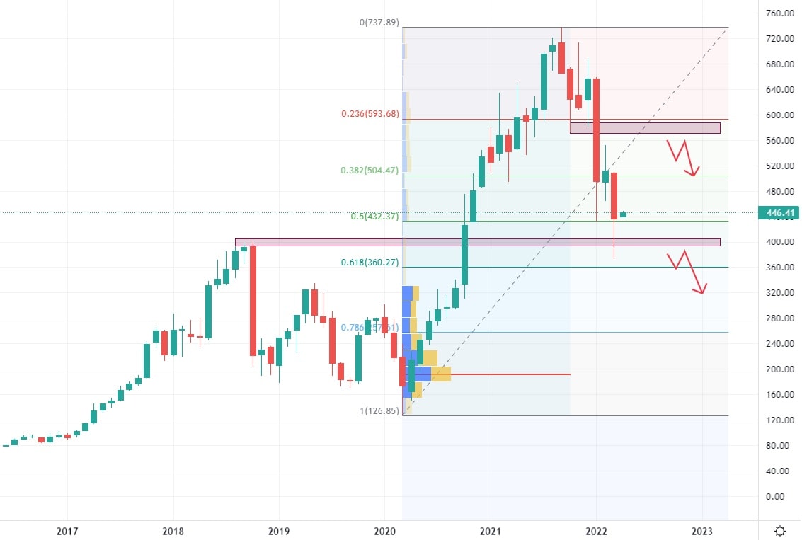 Predikce tržeb pro tuto společnost počítají s růstem ze 4 miliard USD v roce 2021 na 5,8 miliard USD v roce 2023. Pokud by společnost obnovila důvěru investorů, bude první překážkou rezistence až na cenové úrovni 600 USD, což by znamenalo posílení akcií ze současné ceny o 40 %.
