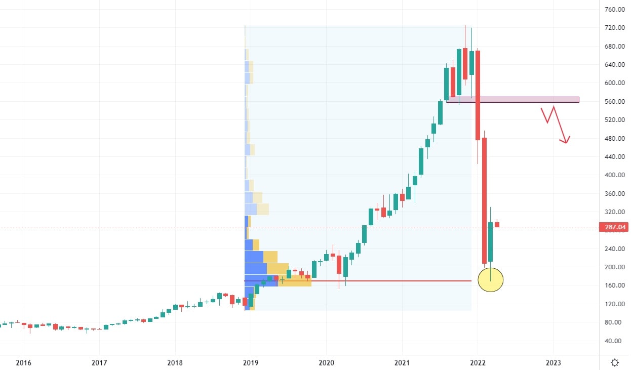 Jejich pád se zastavil až na ceně 160 USD za akcii, která koresponduje s největším Volume na celém cenovém grafu. Meziroční nárůst tržeb o 41,3 % a jejich pozitivní výhled jsou u této společnosti v pozadí fundamentálních zpráv, které budou závislé především na vývoji vojenského konfliktu na Ukrajině.