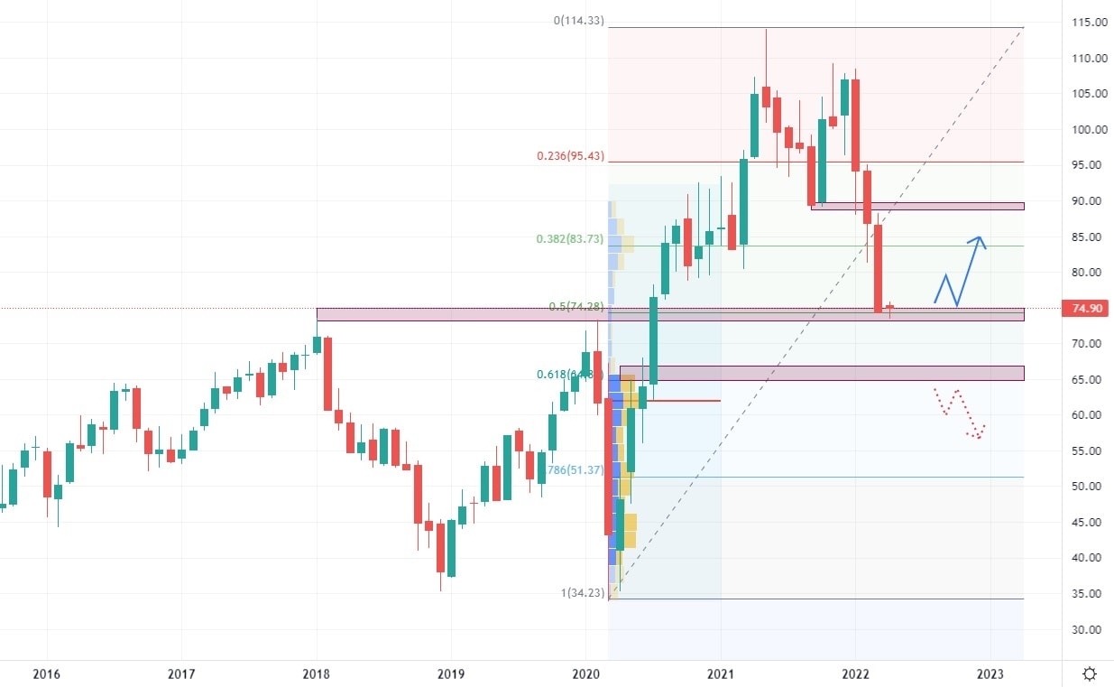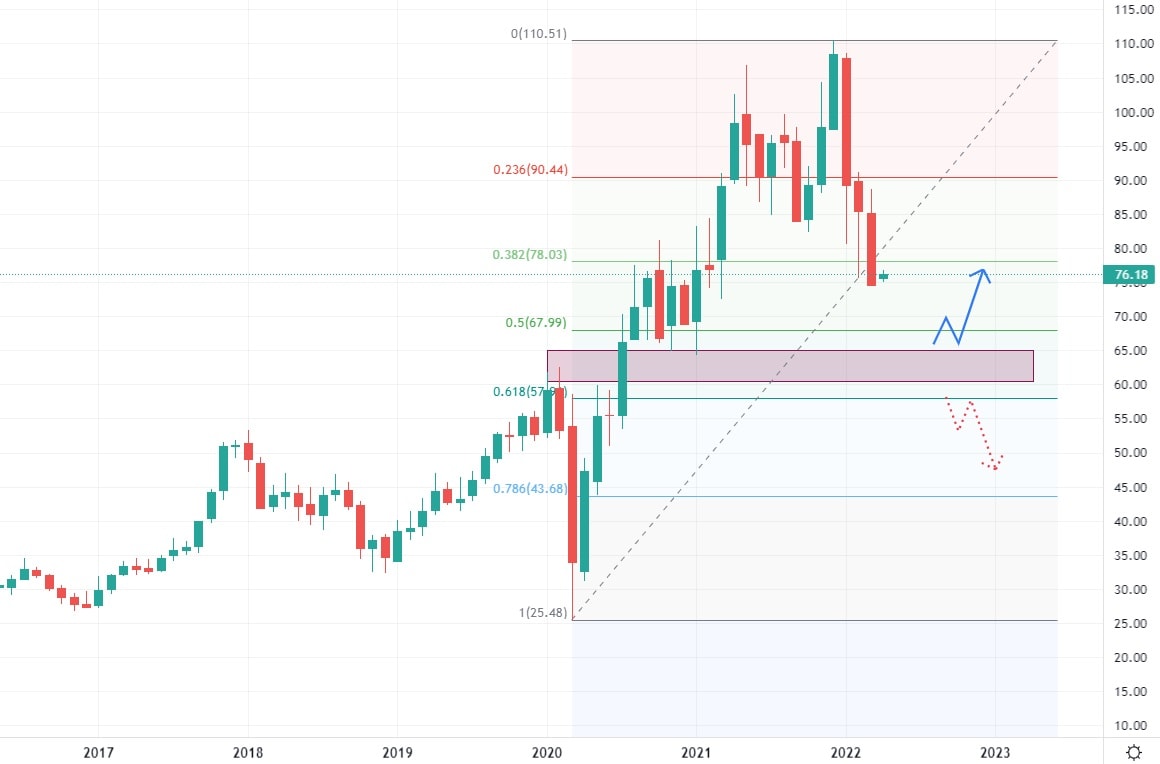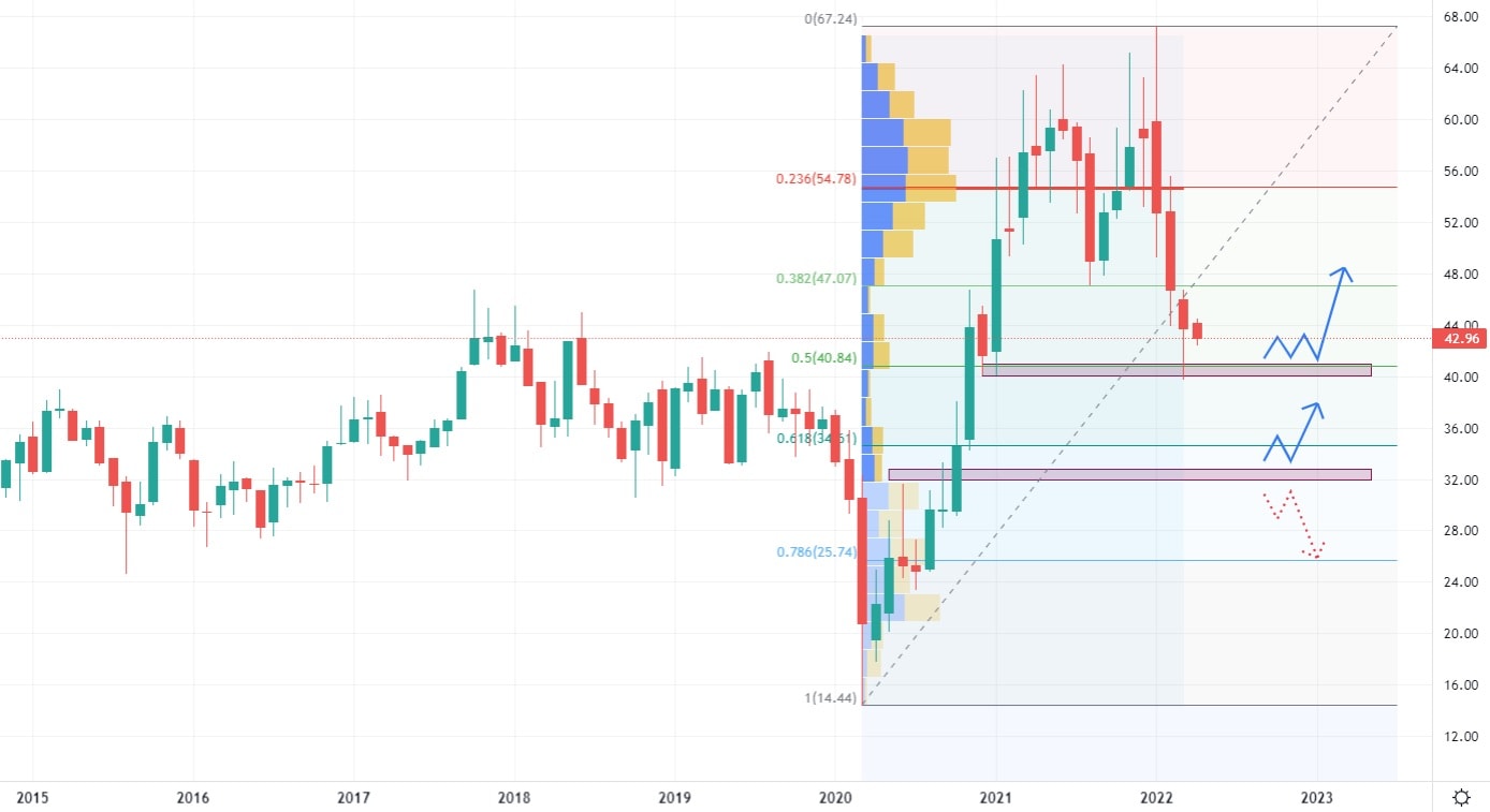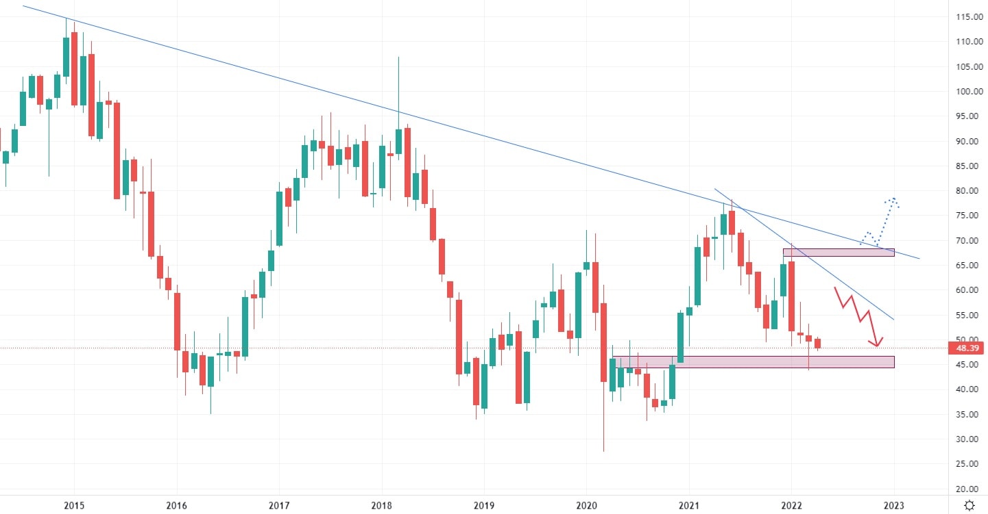 První dobrou zprávou byl meziroční nárůst tržeb o 16 % a druhou dobrou zprávou je dlouhodobá konsolidace akcií na supportní zóně na ceně 45 USD za akcii. První známkou růstového potenciálu bude překonání klesající trendové čáry a potvrzení pozitivních prognóz, které počítají s nárůstem tržeb v roce 2022 o 2 miliardy USD.