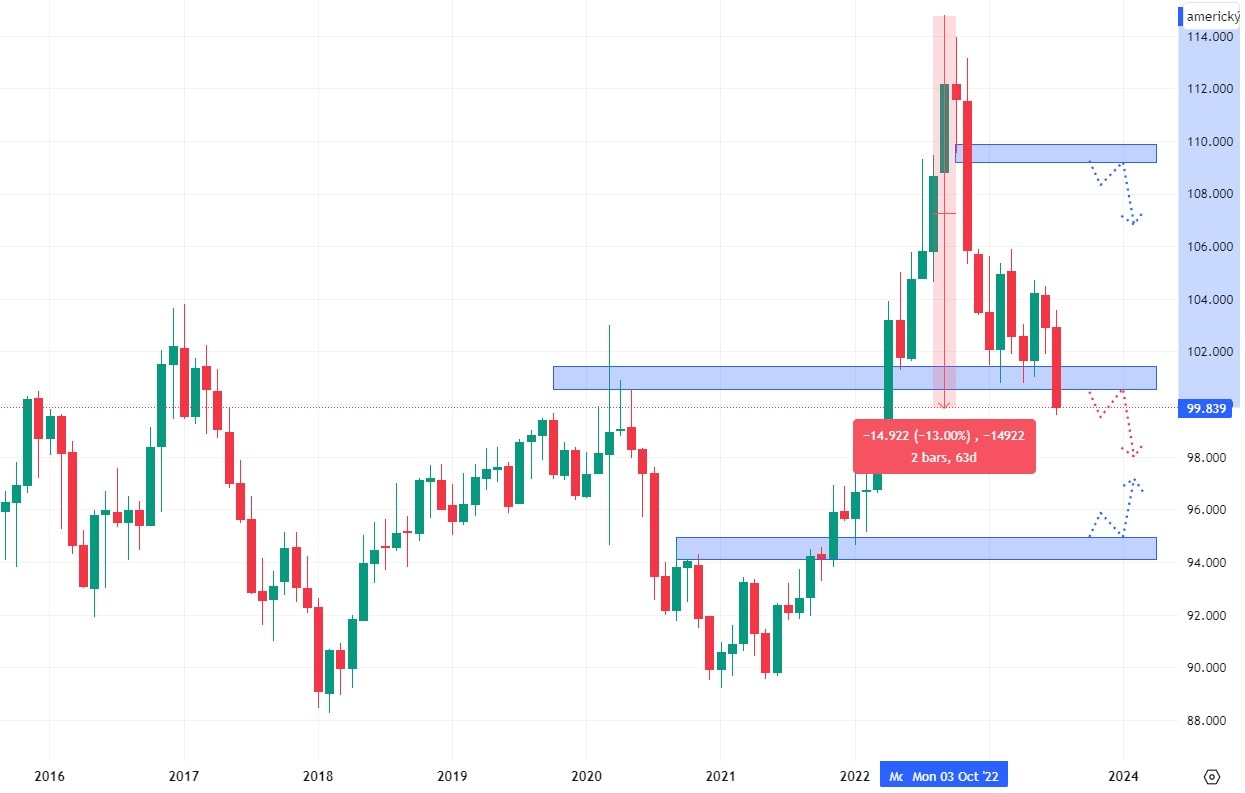 Americký dolar v roce 2022 dosáhl své nejvyšší hodnoty za posledních 20 let. Od té doby ovšem jeho hodnota klesla již o více než 13 %. Většina tohoto poklesu byla realizována v roce 2022 a až do minulého týdne byl letošní rok pro americký dolar spíše neutrální. Neutralita byla způsobena konsolidací indexu DXY na supportu, vzniklém v roce 2020.