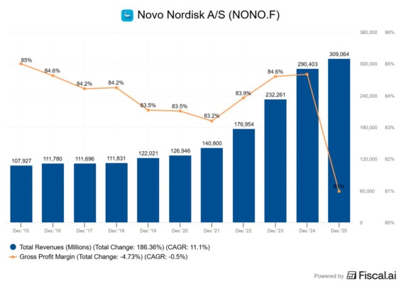 Tržby za celý rok 2025 dosáhly 309 miliard dánských korun. Tempo růstu už ale nepřesahuje 25 %, jako tomu bylo v letech 2022-2024, ale je pouze 6,4 %.
