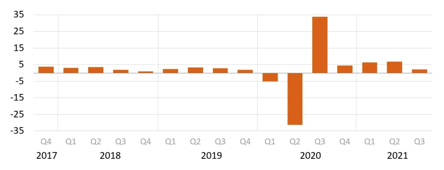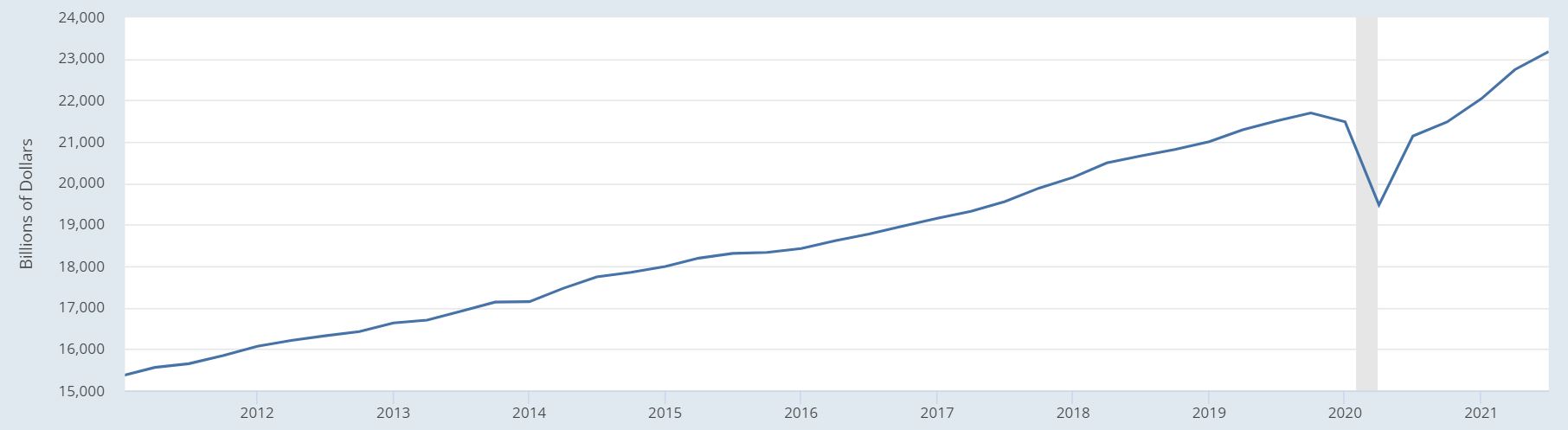Podle předběžného odhadu zveřejněného americkým Úřadem pro ekonomickou analýzu se reálný hrubý domácí produkt (HDP) USA ve třetím čtvrtletí roku 2021 zvýšil meziročním tempem 2,0 %. Ve druhém čtvrtletí se přitom reálný HDP zvýšil o 6,7 %.