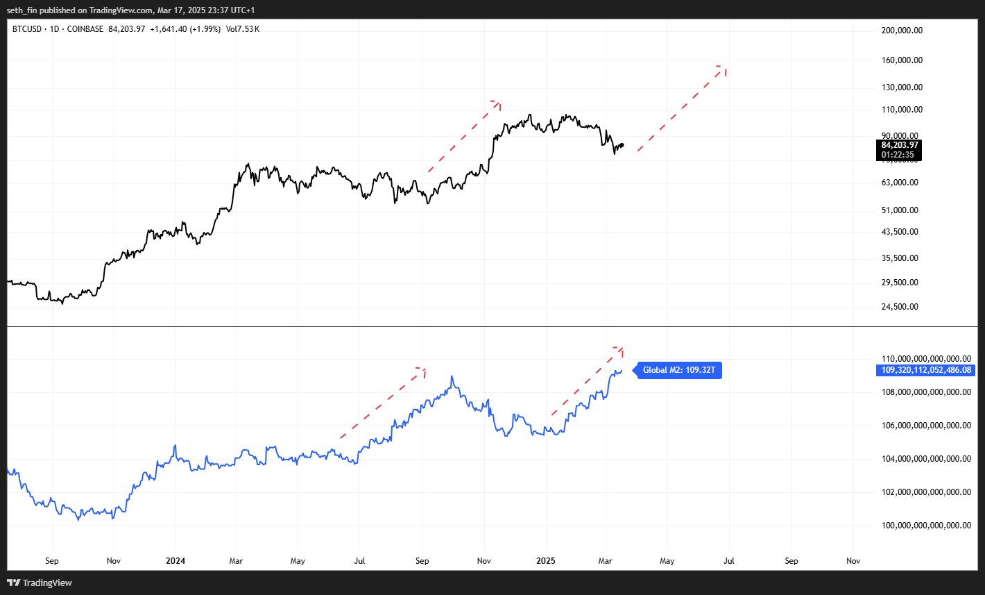 Bitcoin se v současné době obchoduje kolem 82 000 dolarů, což představuje pokles o 15 % za poslední měsíc. Navzdory tomuto poklesu vidí někteří analytici potenciál pro růst, jehož hnací silou bude globální peněžní zásoba M2.
