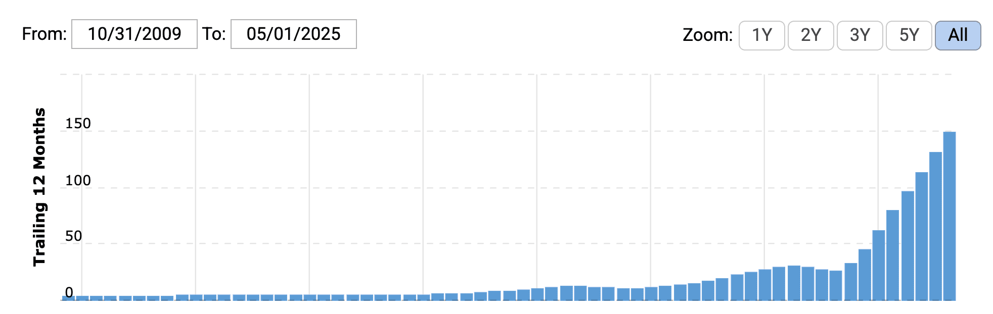 Od roku 2020 roste složeným ročním tempem 100 % ročně – a to už z velmi vysoké základny. Tato čísla naznačují, že Nvidia je pro éru AI tím, čím byl Microsoft pro software nebo Apple pro mobilní zařízení.