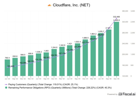 V případě Cloudflaru tento ukazatel roste ještě rychleji než samotné tržby. Naznačuje to silnou poptávku ze strany zákazníků a rostoucí objem dlouhodobých kontraktů.