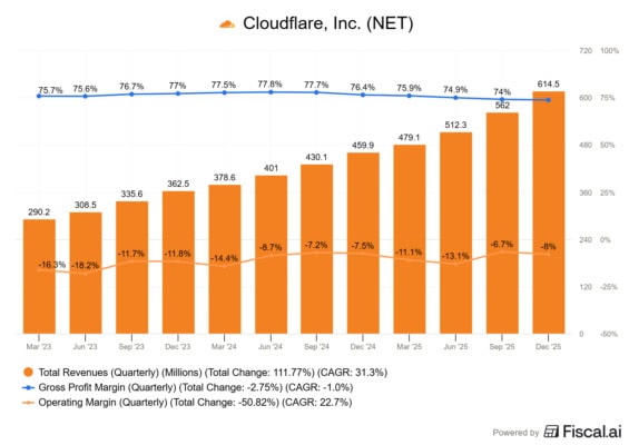Tržby silně rostou, konkrétně zhruba z 290 milionů na více než 600 milionů dolarů kvartálně. Představuje to tempo růstu přes 30 % ročně. To potvrzuje, že poptávka po službách Cloudflaru je reálná a stabilní.