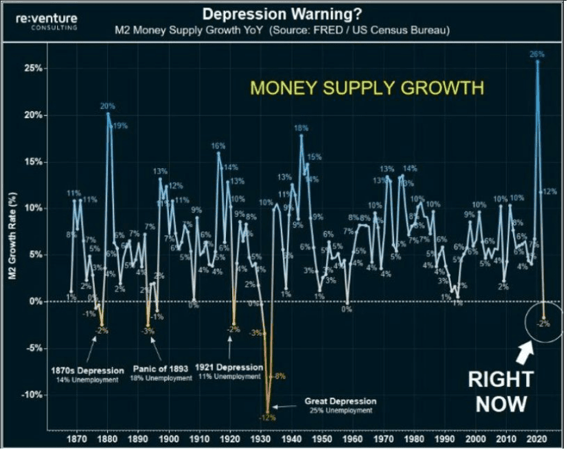 Na přiloženém grafu máme meziroční změnu v peněžní zásobě (M2). A ta je relativně čerstvě záporná, -2 %. Pro nás je nejklíčovější vědět, že posledně došlo ke kontrakci během tzv. velké hospodářské krize na přelomu 20. a 30. let. Poté již dle grafu ke kontrakci nikdy vlastně nedošlo. Pouze ke zpomalení růstu peněžní zásoby M2. Nyní se zaměřte na další data a zjistíte další skutečnost. Pokaždé když se peněžní zásoba dostala do kontrakce, přišla hospodářská recese.