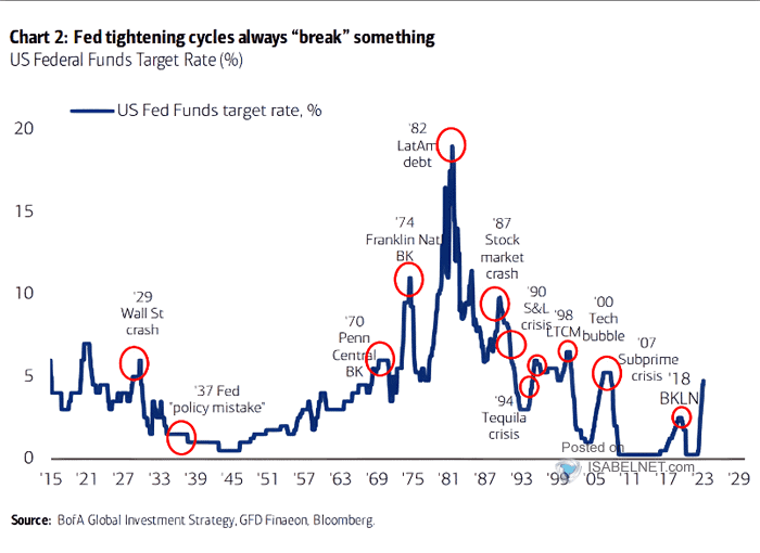 A pokaždé když Fed za předešlých 100 let zvyšoval úrokové sazby, časem se v jednom bodě v ekonomice cosi “zlomilo”. V tom i spočívalo ono částečně vyfouknutí. Následkem je zkrátka krach ekonomiky a akciového trhu. A poté vše běží od znova. Bublina se začne opětovně nafukovat. A to pomocí uvolněné měnové politiky. A takhle pořád dokola. Dřív se k tomu využívalo jenom snížení úrokových sazeb. V poslední době i kvantitativní uvolňování. Protože samotný pokles úrokových sazeb už nefungoval. Když totiž snížíte sazby na nulu, nemáte pak co uvolňovat.