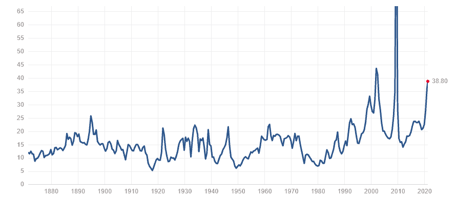 Nyní se dostáváme k poslednímu grafu, který nám znázorňuje P/E ratio u indexu S&P 500. P/E činí 38,8 bodů, což nám říká, že je hodnota indexu vysoce nadhodnocena. U posledních dvou krizí byla ta čísla ještě vyšší, v roce 2009 byl poměr dokonce 123,73 bodů.