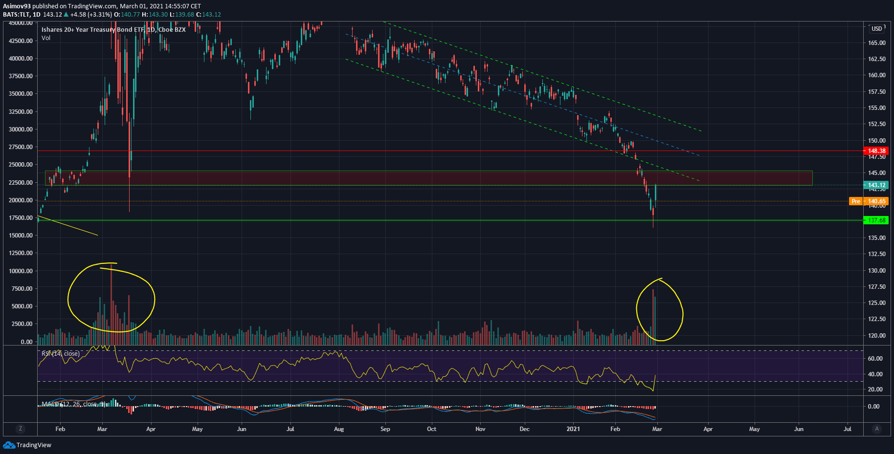 Čtvrteční svíce zavřela jako Pin bar a denní objemy byly asi 3-4násobné oproti normálu. Pátek to samé, díky čemuž se price action začalo podobat vývoji z února/března 2020. Jestli je tedy skutečně ve hře obrat na dluhopisovém trhu, akciový trh má problém.