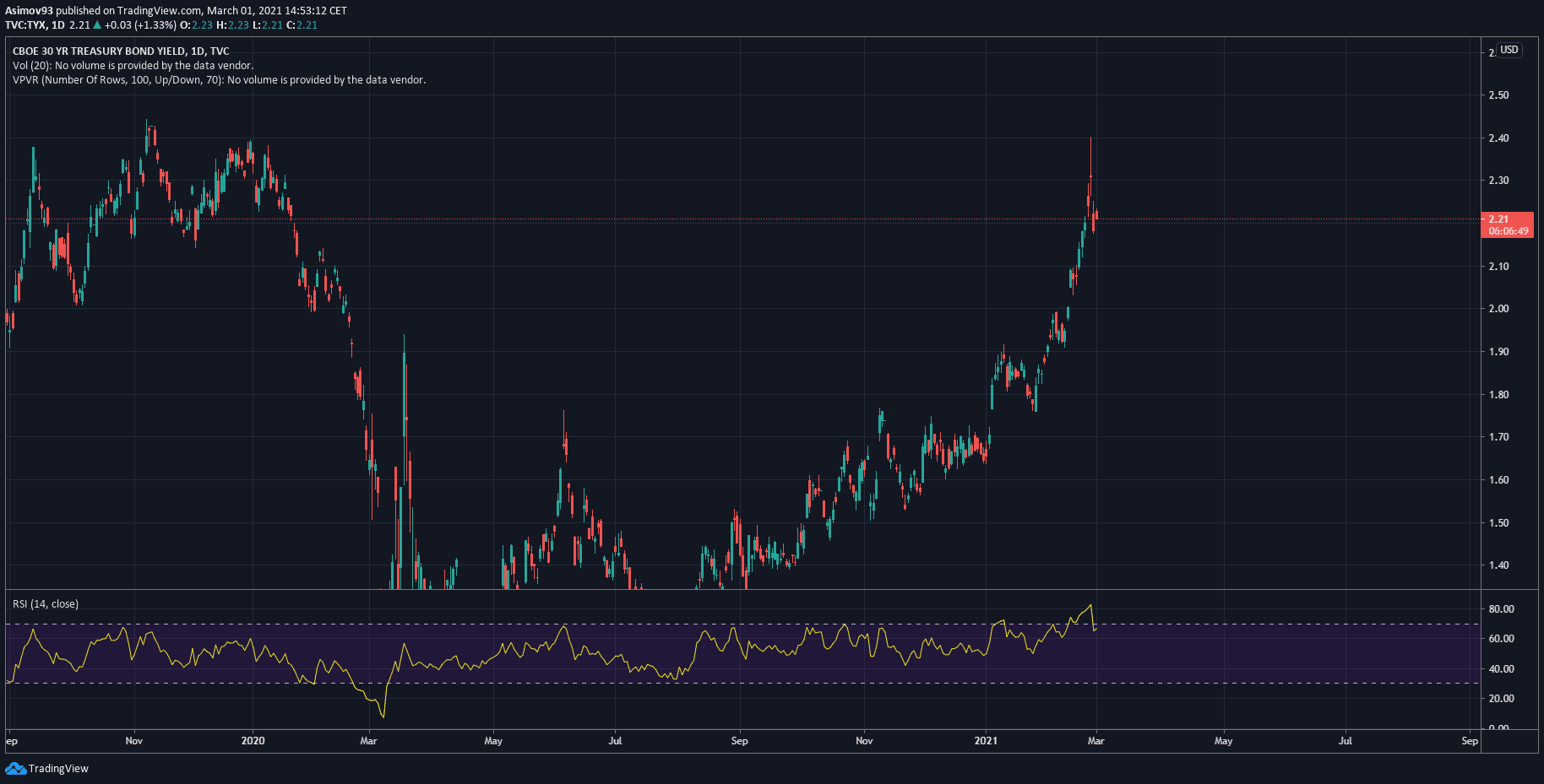 Tržní úroková míra u vládních dluhopisů s delší splatností (TYX). Zdroj: tradingview.com