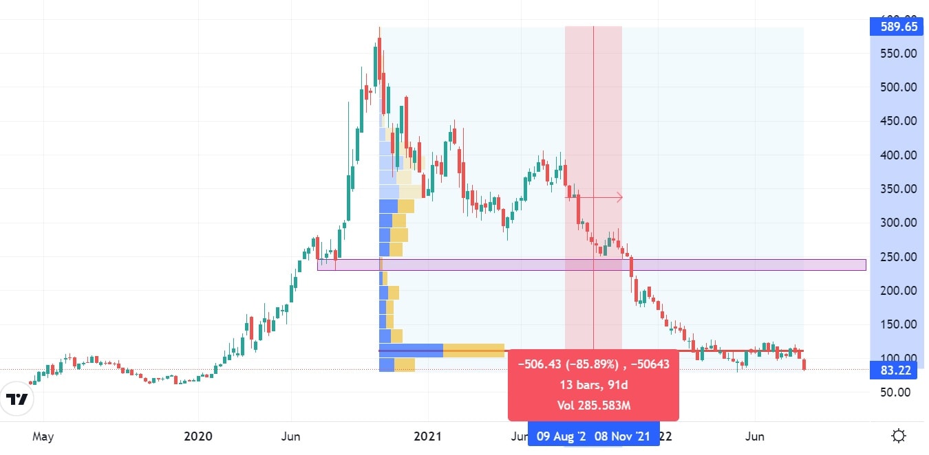 Společnost Zoom, která provozuje stejnojmennou platformu, sloužící k videohovorům a skupinovým konferencím, se s návratem k “normálnímu životu” po covidu dostala do problémů, které vyústily současným propadem téměř 86% hodnoty jejich akcií. Současná konsolidace trhu vytvořila nejsilnější volume v rámci celého akciového poklesu Zoom, což při jeho pokračování bude znamenat vznik silné rezistence.