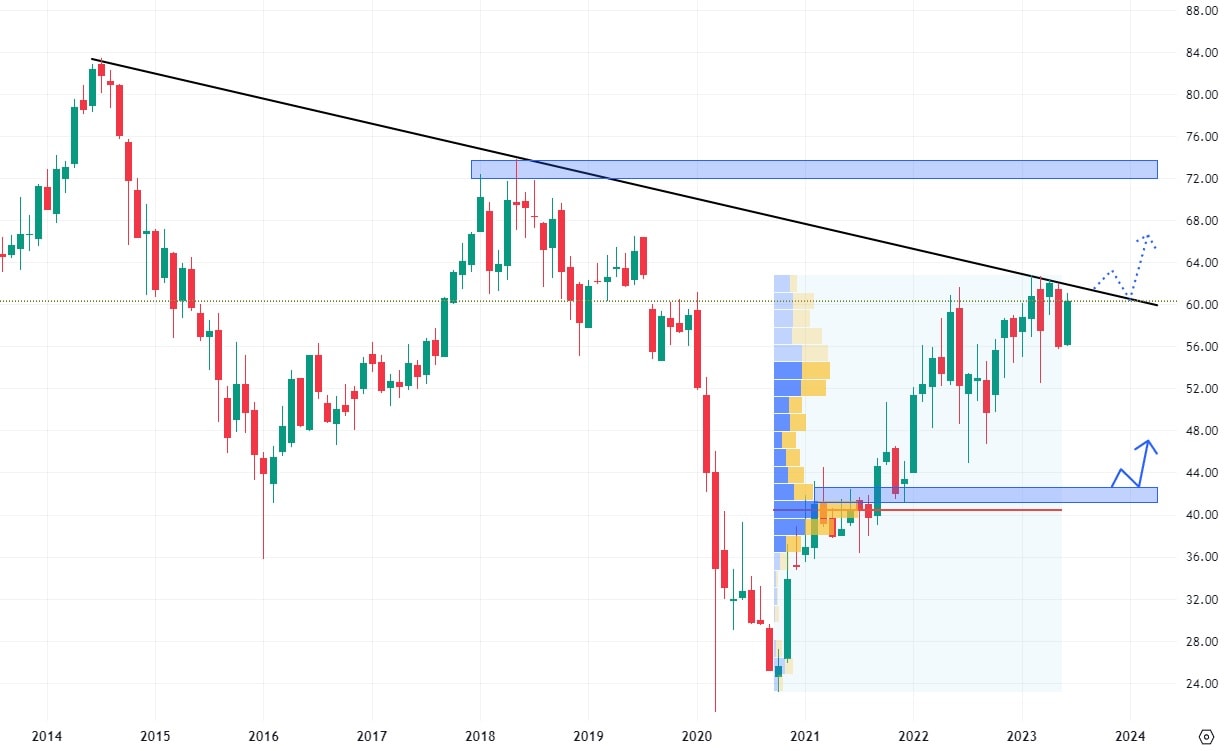 Pokud dojde k breakoutu trendové linie, bude se nejbližší rezistence nacházet na hodnotě cenových maxim z roku 2018 na ceně 75 USD. Naopak, dojde-li opět k odrazu od trendové čáry, mohou akcie klesnout až na hodnotu nejvyššího volume v rámci posledního up trendu na ceně 45 USD za akcii.