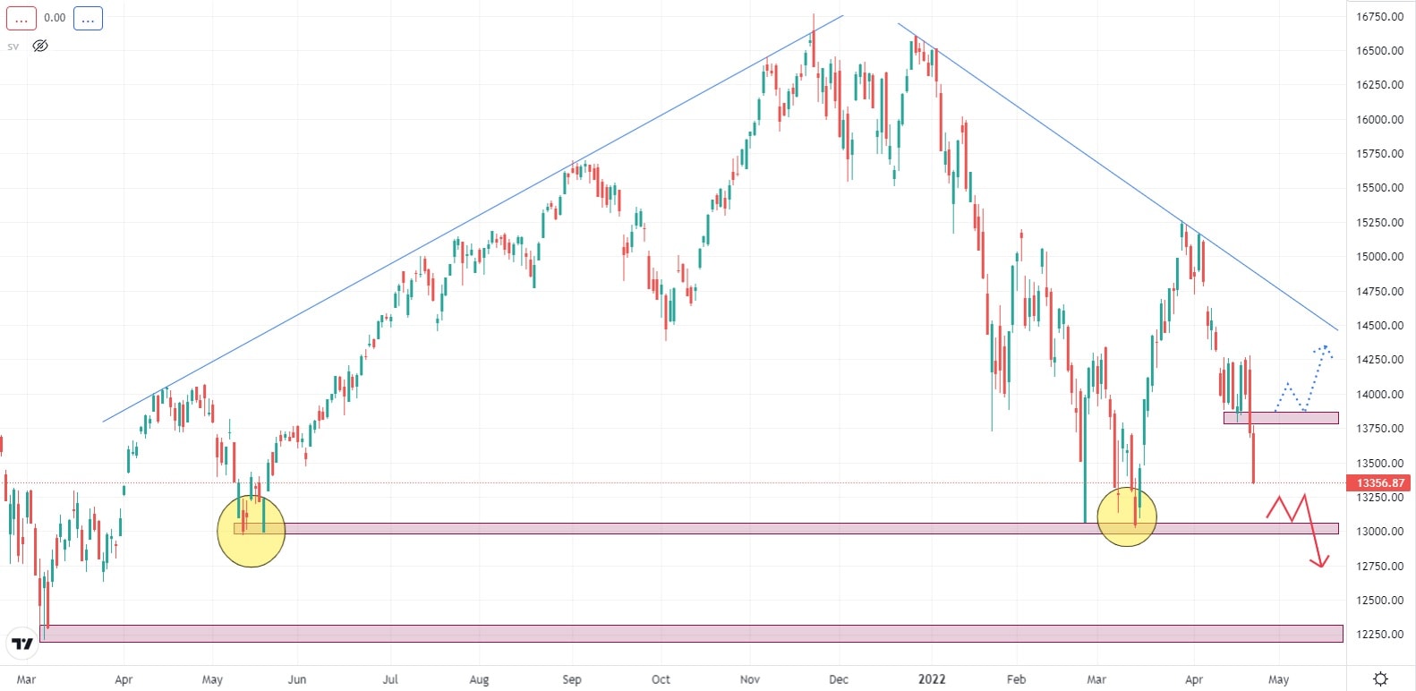 Vzhledem k tomu, že support již po dvou testech nemusí mít dostatečnou podpůrnou schopnost, může se technologický index během následující dní propadnout ještě více. Za tímto největším denním propadem od roku 2020 stojí reakce investorů najestřábí komentář předsedy Federálního rezervního systému Jerome Powella, ohledně urychleného výhledu zvyšování úrokových sazeb.