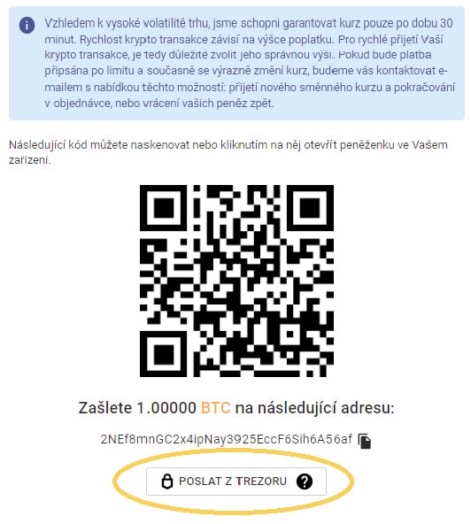 Poté, co vytvoříte objednávku na prodej určitého počtu bitcoinů nebo jednotek jiné kryptoměny, se pod platebními údaji objeví tlačítko “Poslat z Trezoru”, které zmáčkněte.