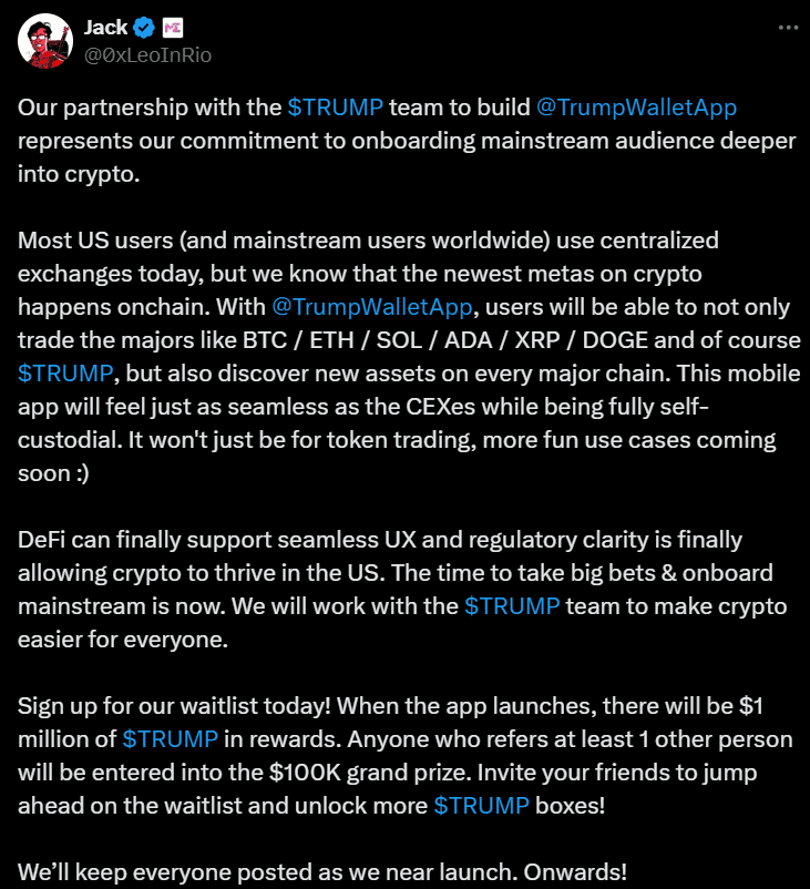 Šéf platformy Magic Eden, Jack Lu, ještě ten den zveřejnil na síti X příspěvek o tom, že se NFT tržiště spojilo s týmem stojícím za $TRUMP tokenem, aby spustilo oficiální Trumpovu peněženku.
