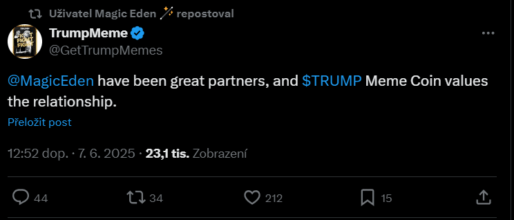 Platforma Magic Eden pak pouze nasdílela příspěvek účtu TrumpMeme, kde stojí, že Magic Eden je skvělým partnerem a Trumpův meme coin si váží tohoto partnerství.