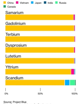 Graf ilustrující naprosto dominantní postavení Číny (žlutě) na zpracování těchto prvků