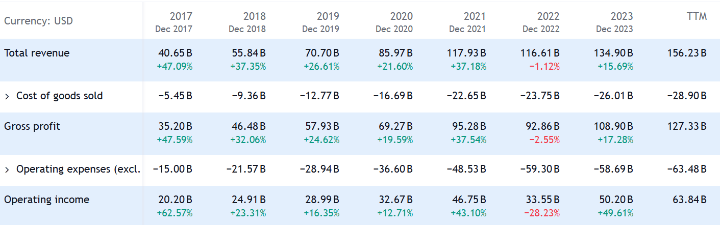 Firmě rostou výnosy prakticky každým rokem a celkové finanční výsledky za rok 2024 na tuto trajektorii opět navážou, protože firma očekává tržby ve výši 156 miliard dolarů (za rok 2023 byly tržby 134,9 miliardy dolarů).