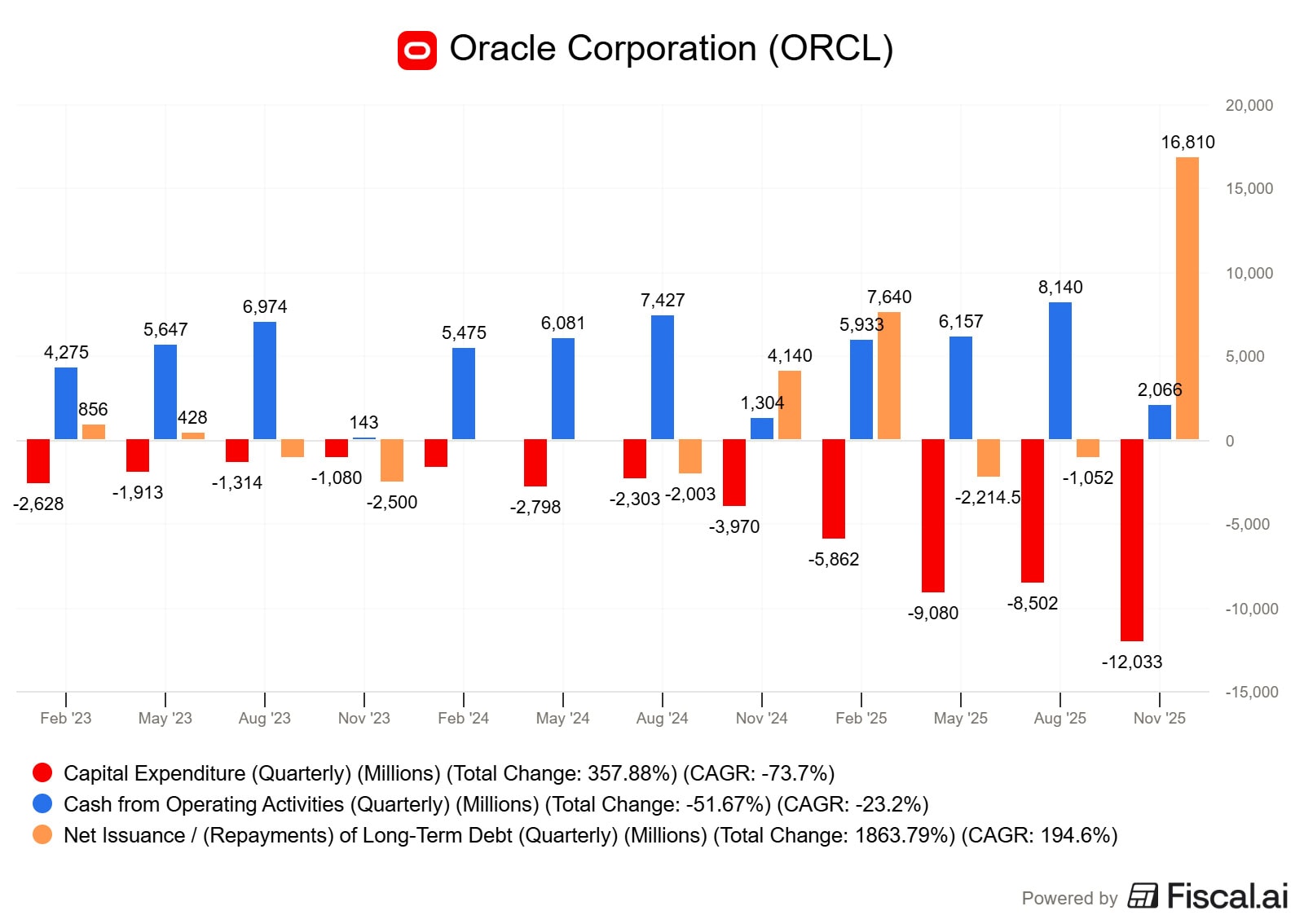 Za posledních 12 měsíců Oracle vygeneroval cash flow z provozní činnosti ve výši přibližně 22,3 miliardy dolarů.