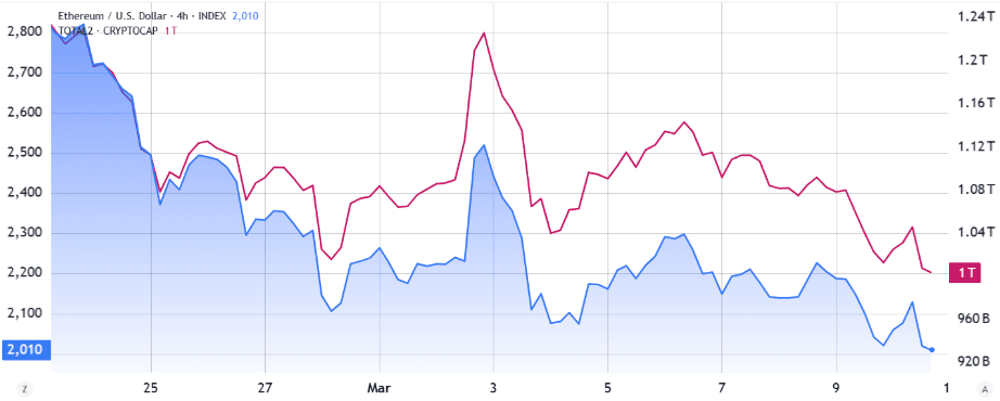 Ethereum, druhá největší kryptoměna dle tržní kapitalizace, se propadlo od prosince o více než 50 % a dnes dokonce otestovalo úroveň 1 750 dolarů.
