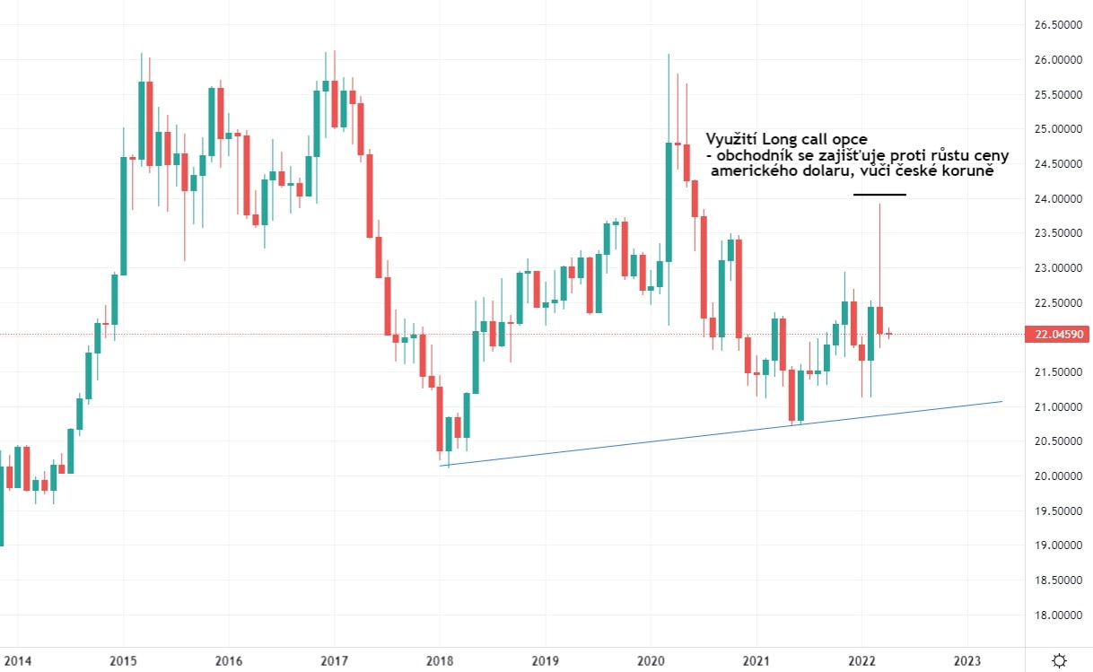 Princip využití Long Call opce, s cílem se zajistiti proti růstu kurzu USD/CZK