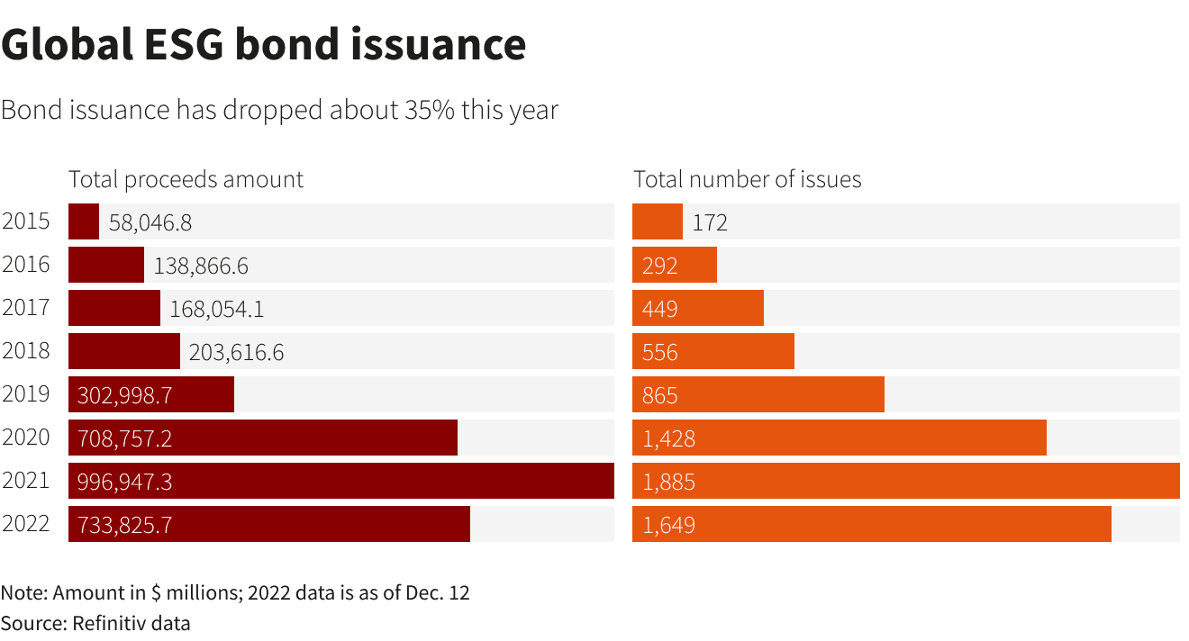 Množství peněžních prostředků, které společnosti získaly prostřednictvím udržitelných dluhopisů, jako jsou zelené dluhopisy, stejně jako objem kapitálových firem v udržitelných odvětvích, které získaly na dluhových nebo akciových kapitálových trzích, v roce 2022 klesl se zhoršením ekonomického výhledu.