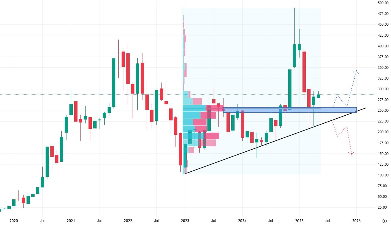 Na měsíčním cenovém grafu není zřetelná žádná zásadní rezistentní zóna, což by bylo výhodné především v situaci, kdy by se prodeje elektromobilů začaly zlepšovat, případně by sám Elon Musk vyřešil otázku svého působení ve firmě.