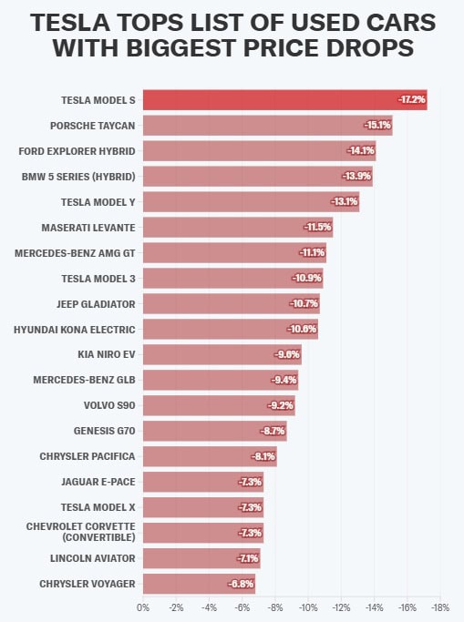 Problém je také s prodejem ojetých vozů Tesla a jejich cenou. Například Tesla Model S je elektromobil, který ztrácí jako ojetina nejvíce na své hodnotě. V žebříčku 20 modelů poté figurují další 3 modely Tesla.
