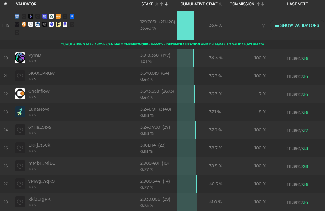 V distribuci validátorů můžeme najít velké rozdíly. Alarmující je fakt, že pouze 19 validátorů zodpovídá za více než 33 % všech validovaných transakcí. Pro Solanu to znamená velmi malý počet potenciálních bodů selhání – v tomto případě cílů útočníků. Pro zahlcení, nebo přímo zástavu sítě, se tedy stačí zaměřit pouze na vybrané skupiny validátorů. Rozdělení validátorů v kombinaci s chováním Solana Foundation mimo jiné velmi sráží skutečnou míru decentralizace.