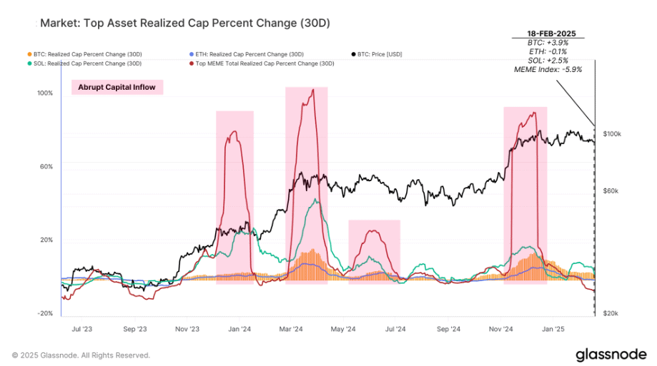 CryptoVizArt, analytik společnosti Glassnode, tento pokles připisuje sníženým investicím do meme coinového sektoru a zaznamenává pokles měsíčního přílivu kapitálu z maxima během prosince 2024.