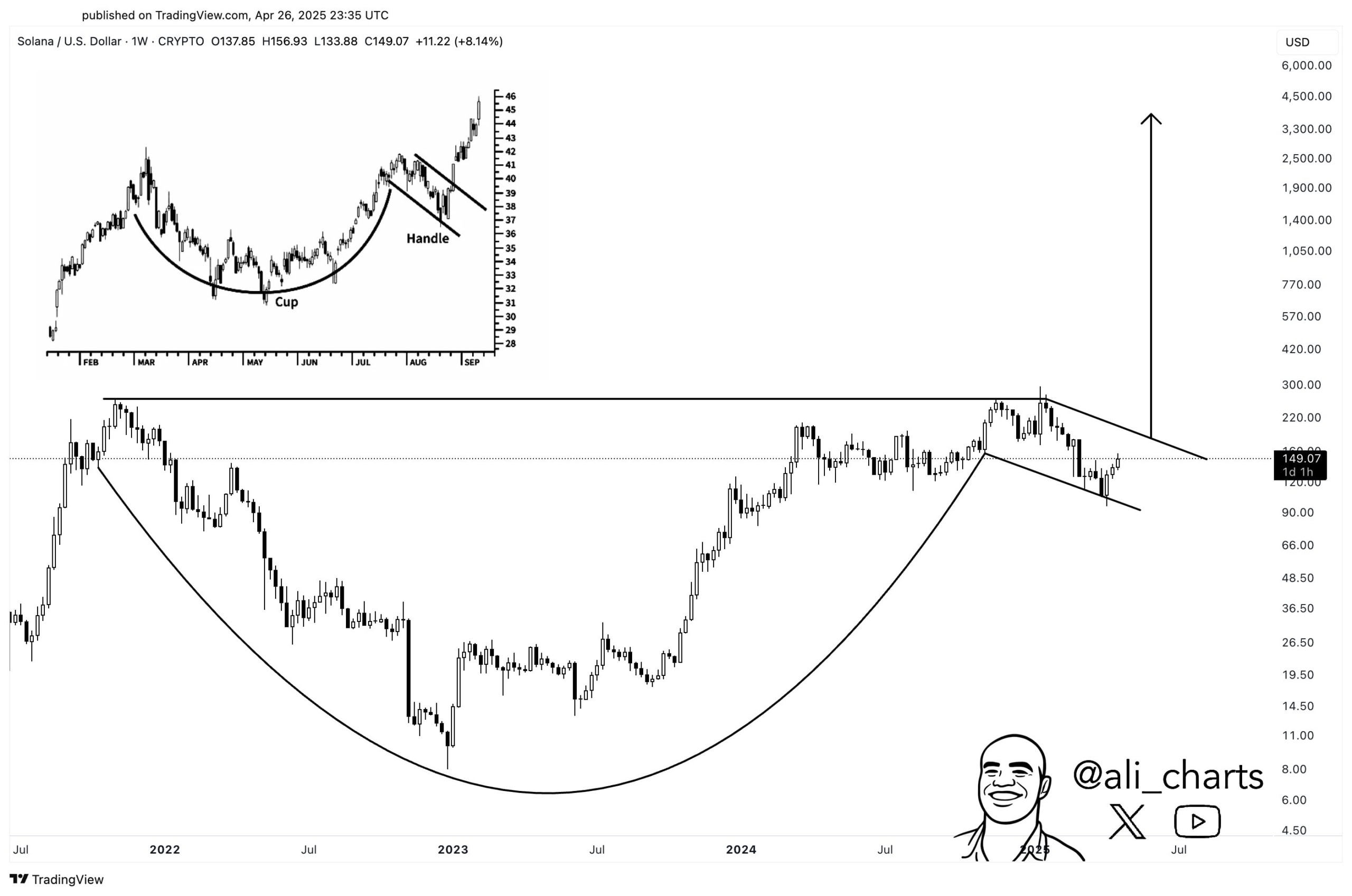 Jak upozornil obchodník vystupující pod přezdívkou Ali Martinez, na cenovém grafu Solany lze vidět býčí vzorec cup and handle, který vizuálně připomíná šálek s uchem.
