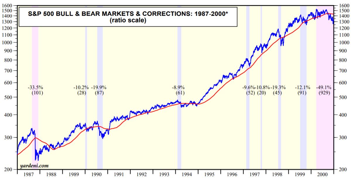 Vývoj hodnoty indexu S&P 500 v letech 1987–2000 včetně zaznamenaných korekcí. Zdroj: Yardeni Research