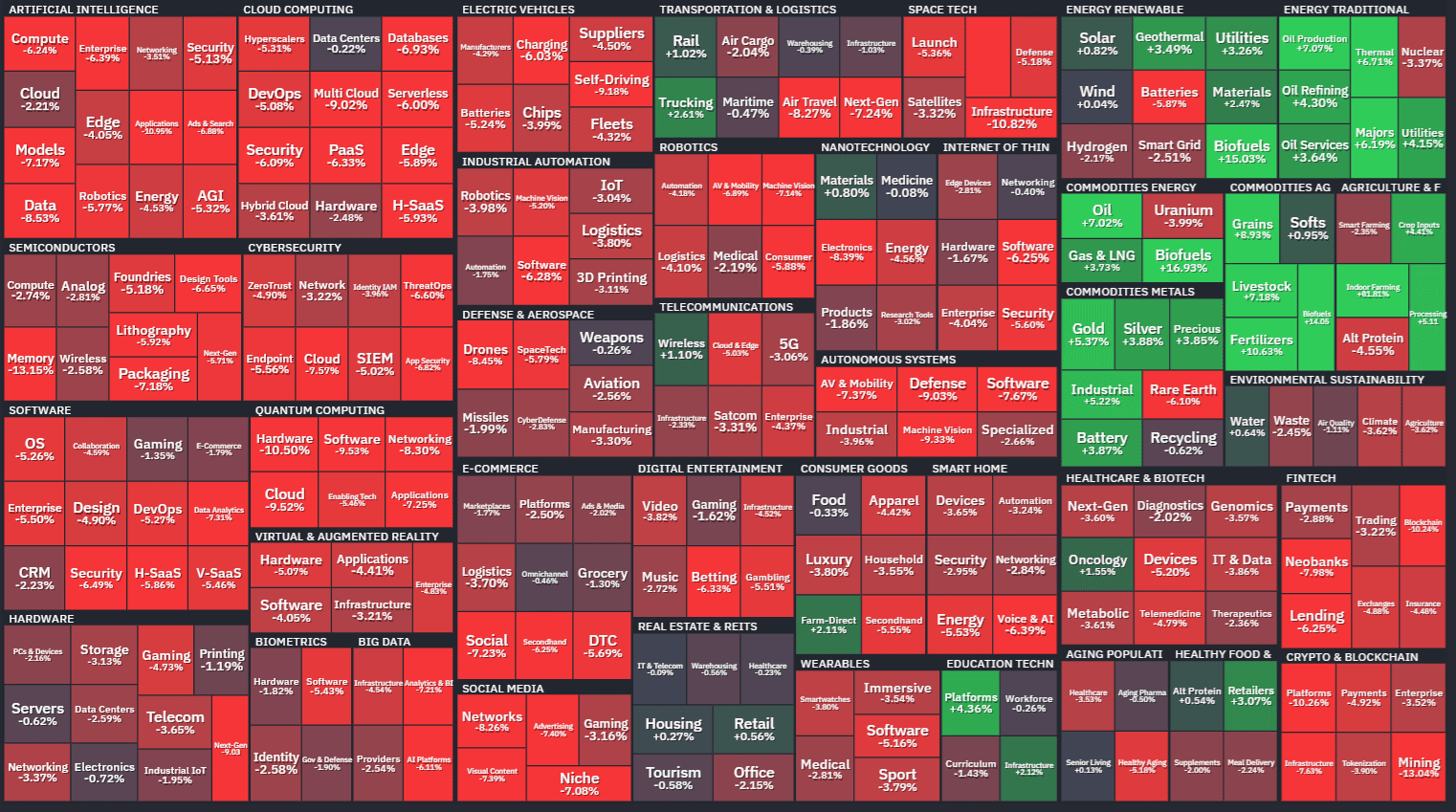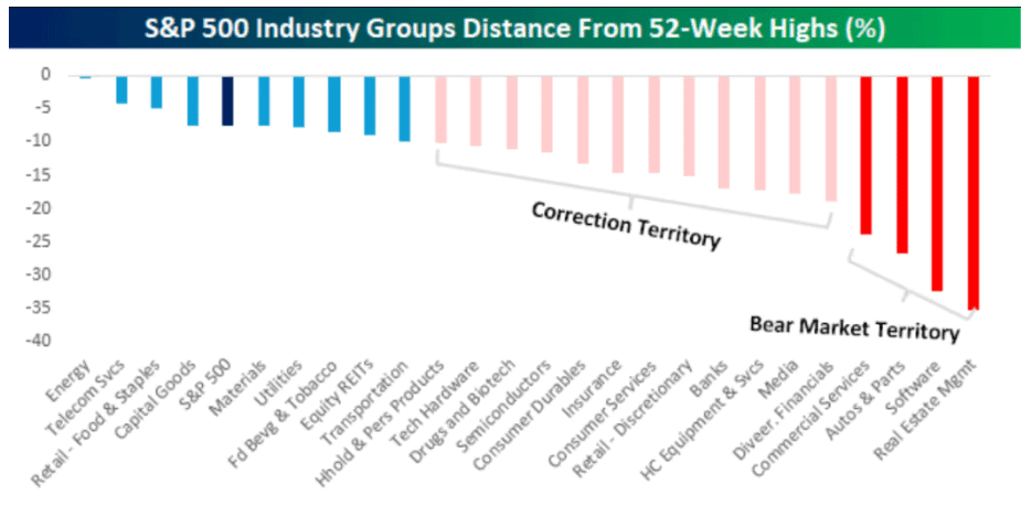Analytici z Bespoke Investment Group prozkoumali všech 25 zmíněných skupin a zjistili, že za uplynulý týden jich 16 uzavřelo minimálně 10 % pod svými 52týdenními maximy.