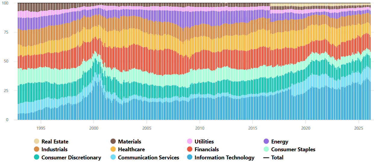 Vývoj váhy u indexu S&P 500 v rámci jednotlivých sektorů