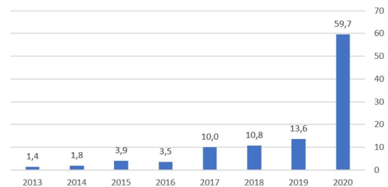I zde je řeč čísel více než zajímavá. 18násobý nárůst uživatelů během pouhých dvou let, meziroční nárůst obratu o 87 %… navíc má toto odvětví velký a dosud nevyužitý potenciál.