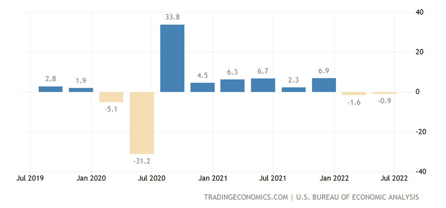 Pod technickou recesí rozumíme, když HDP dva kvartály po sobě klesá. A to se i stalo. Za první kvartál HDP meziročně kleslo o 1,6 % a za druhý kvartál o 0,9 %. Nejsou to velké poklesy. Ovšem stačí na to, abychom mohli konstatovat, že Spojené státy jsou v technické recesi.