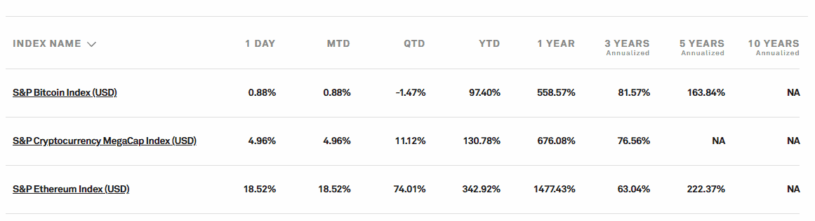 Celkově se snaží S&P pokrýt tu nejdůležitější část trhu. Prvním indexem je prostý S&P Bitcoin Index (ticker SPBTC), který kopíruje vývoj bitcoinu. Jeho tržní kapitalizace je v době vydání článku na hranici 1 miliardy dolarů.