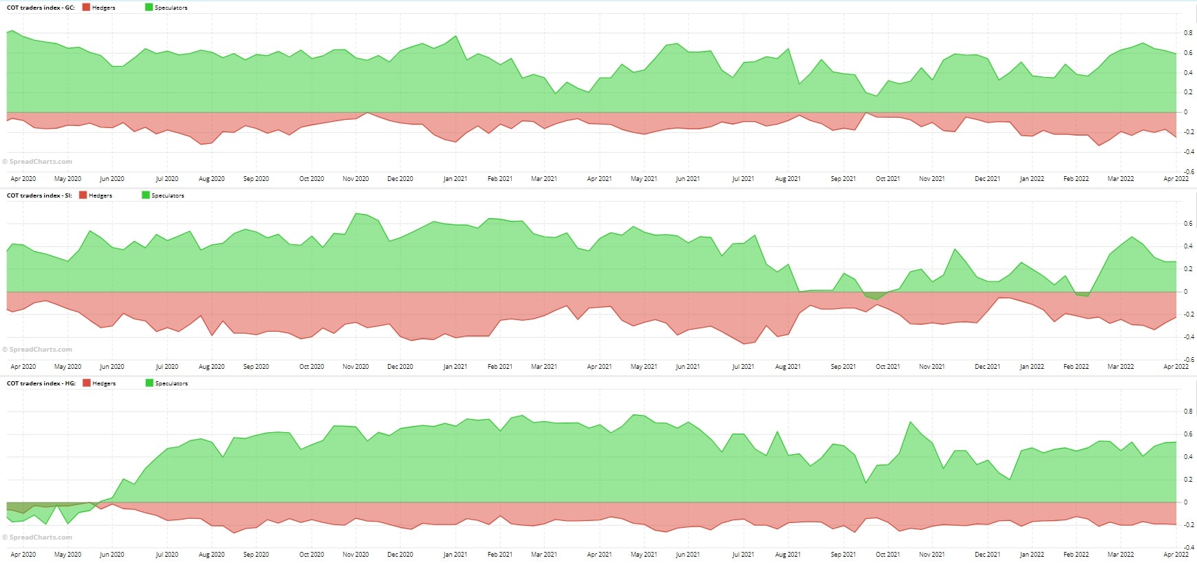 Na grafu níže lze pozorovat rozložení obchodníků na futures trhu se zlatem, stříbrem a mědí. Zelenou křivkou jsou vyznačení Spekulanti, tedy malý investoři, červenou křivkou jsou označení Hedgers, tedy velké investiční instituce. Všechny tři trhy jsou v současné době ovládány především Spekulanty, tedy těmi drobnými investory, kteří podléhají emocionálním výkyvům navzdory dlouhodobé investiční strategii.