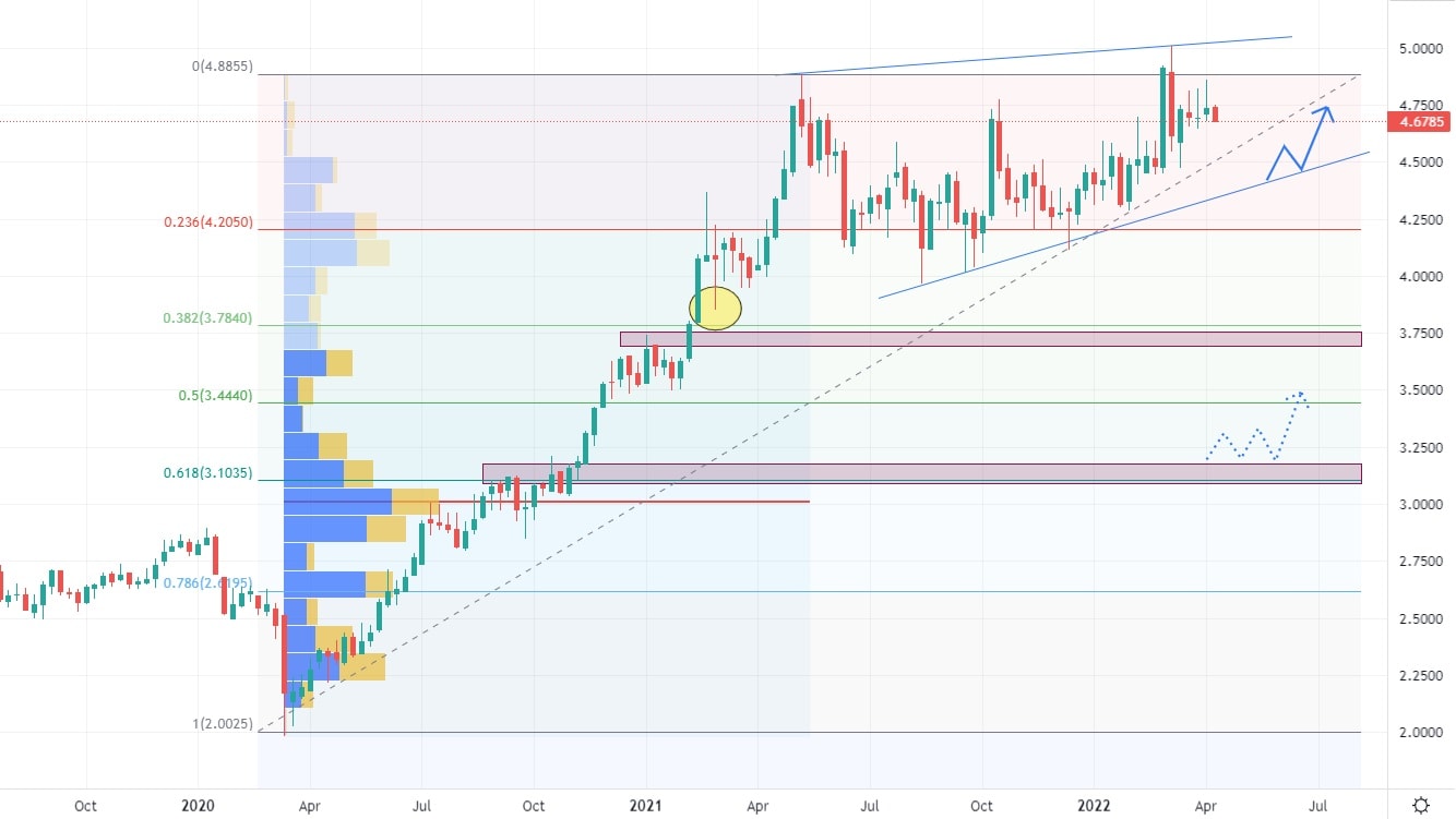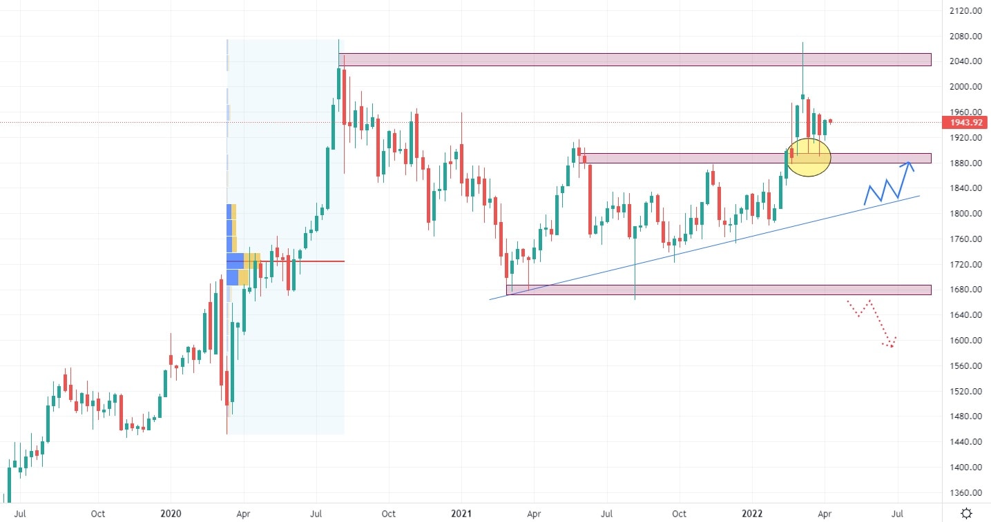 Trh se zlatem vykazuje v dlouhodobějším měřítku postranní pohyb, který je z jedné strany tvořen maximální cenou a z druhé strany je podporován silnou Volume oblastí. Vytvořená rostoucí trendová čára uvnitř postranního trendu pomohla trhu k atakování historických maxim, na které bylo reagováno opět výprodejem, nicméně tentokrát se nejednalo o nic dramatického.