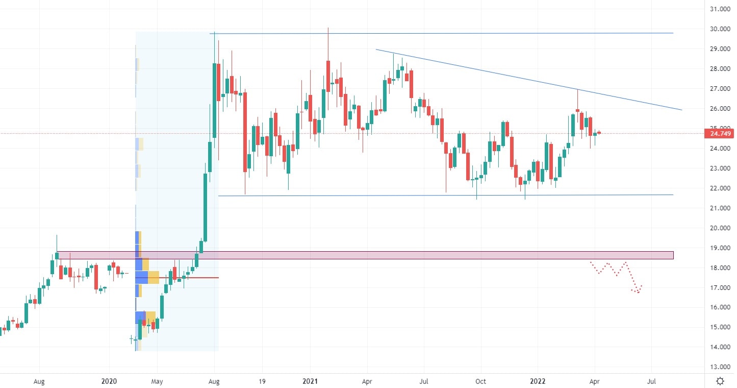 Obdobný postranní trend jako zlato, vykazuje i druhý drahý kov stříbro. Po silném růstu ze začátku roku 2020 se stříbro obchoduje v postranním trendu, v jehož rámci se utváří klesající trendová čára. Vzniklá obratová formace Pin Bar v konfluenci s klesající trendovou čarou mohou způsobit pokles stříbra na Low postranního trendu. Pokud by došlo k výraznějšímu oslabení, může být zajímavá cenová úroveň 19 USD, kde je support tvořen silnou Volume.
