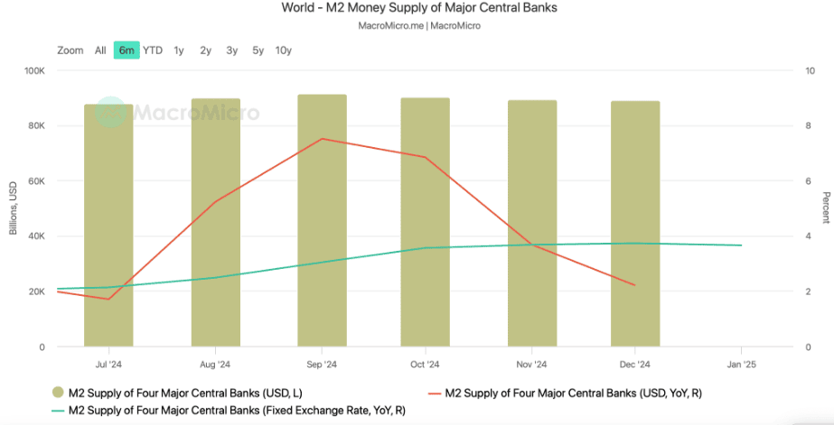 Podle dat MacroMicro dosáhl v lednu meziroční fixní kurz peněžní zásoby M2 mezi čtyřmi hlavními centrálními bankami 3,65 %.