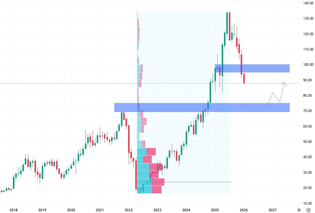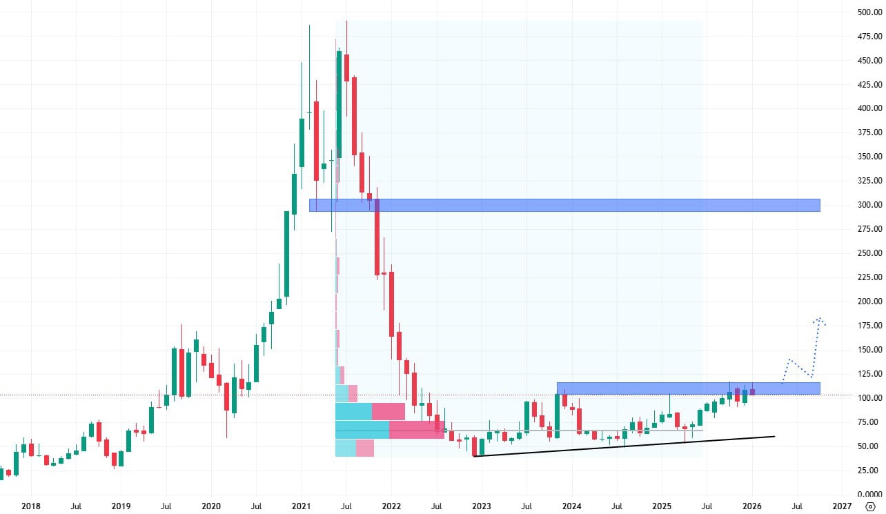 Akcie Roku se od svíce cenového pádu v roce 2023 obchodují v mírném růstovém trendu s tím, že se tempo tohoto růstu postupem času zrychluje. Aktuálně akcie testují rezistenci na ceně 100 USD.