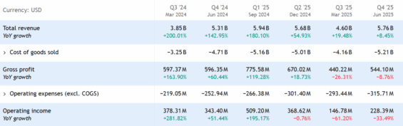 Ve čtvrtém čtvrtletí tržby Supermicro meziročně vzrostly o 8,45 % na 5,76 miliardy USD, což bylo pod očekávánými 5,89 miliardy USD a blízko spodní hranice firemního odhadu 5,6–6,4 miliardy USD.