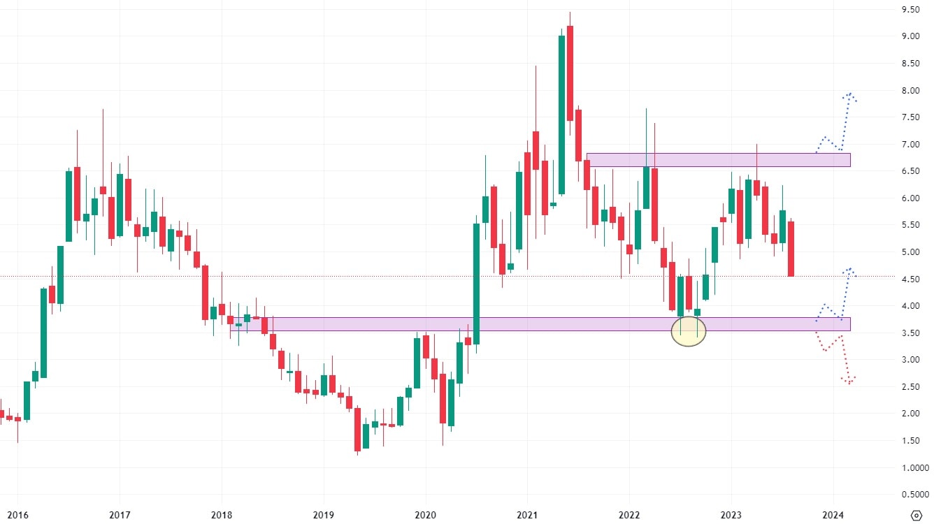 Akcie Hecla Mining se po většinu své existence obchodovaly pod úrovní 10 USD, což z nich činní velmi levný finanční instrument. V roce 2020 akcie ukázaly, že mají sílu růst a z ceny nad 1 USD jejich hodnota vzrostla na 9,5 USD. Od vytvoření tohoto high se ovšem akcie obchodují pod hodnotou 9 USD s tím, že trh již otestoval nejbližší support a vypadá to, že se brzy dočkáme i jeho retestu. Pokud support cenu neudrží a ta klesne pod 3 USD, mohou akcie Hecla Mining klesnout opět na své minimum.