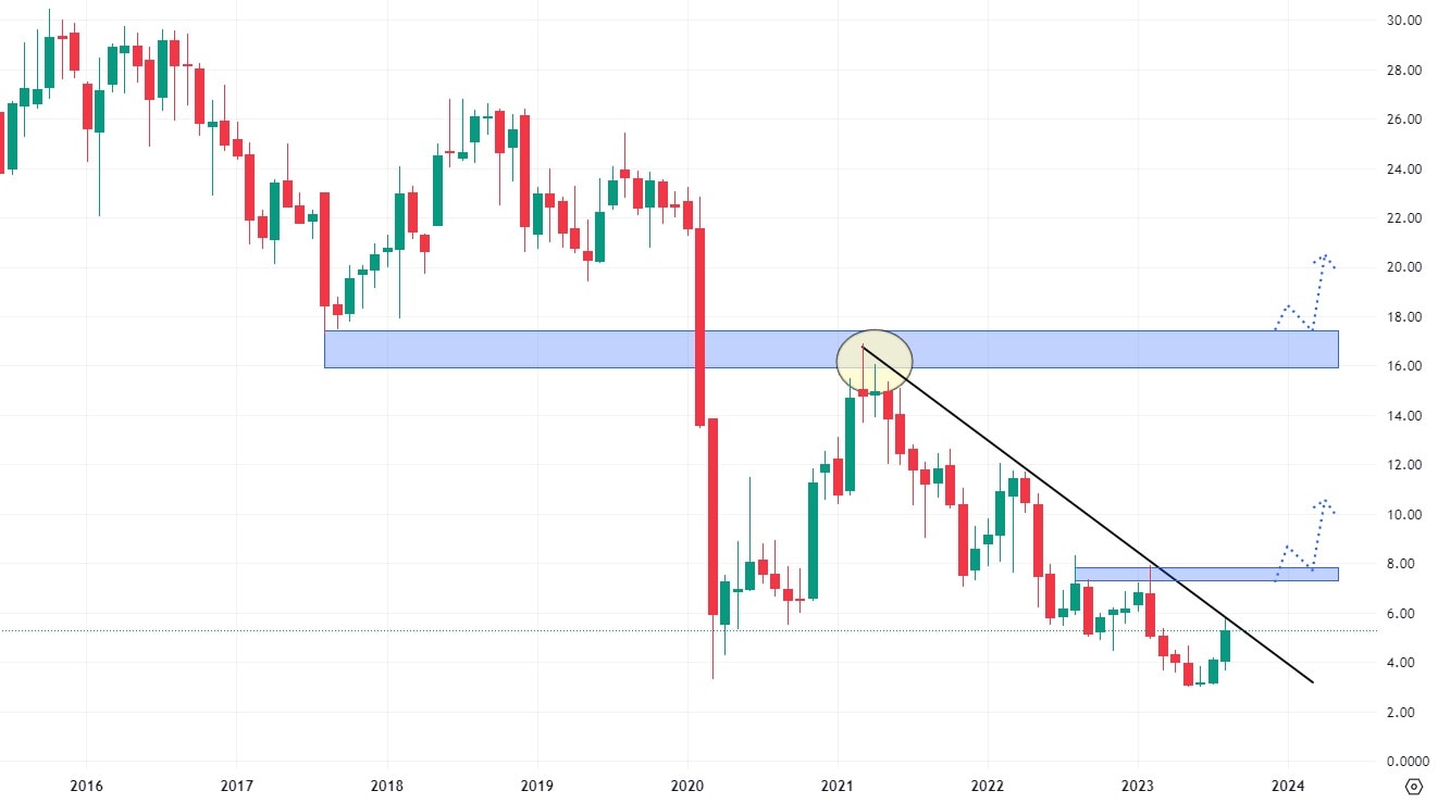 Dlouhodobý klesající trend v rámci nízké volatility vykazují akcie Marqeta již od začátku roku 2022. S nástupem letních měsíců se situace poněkud zlepšila, ale co se týče volatility jednotlivých svíček, jedná se stále pouze o drobný cenový růst. První bariérou bude pro akcie horní hrana klesajícího kanálu, po jejíž proražení budou mít akcie možnost růst dále až na hodnotu 20 USD, kde se nachází prozatím netestovaná rezistence.